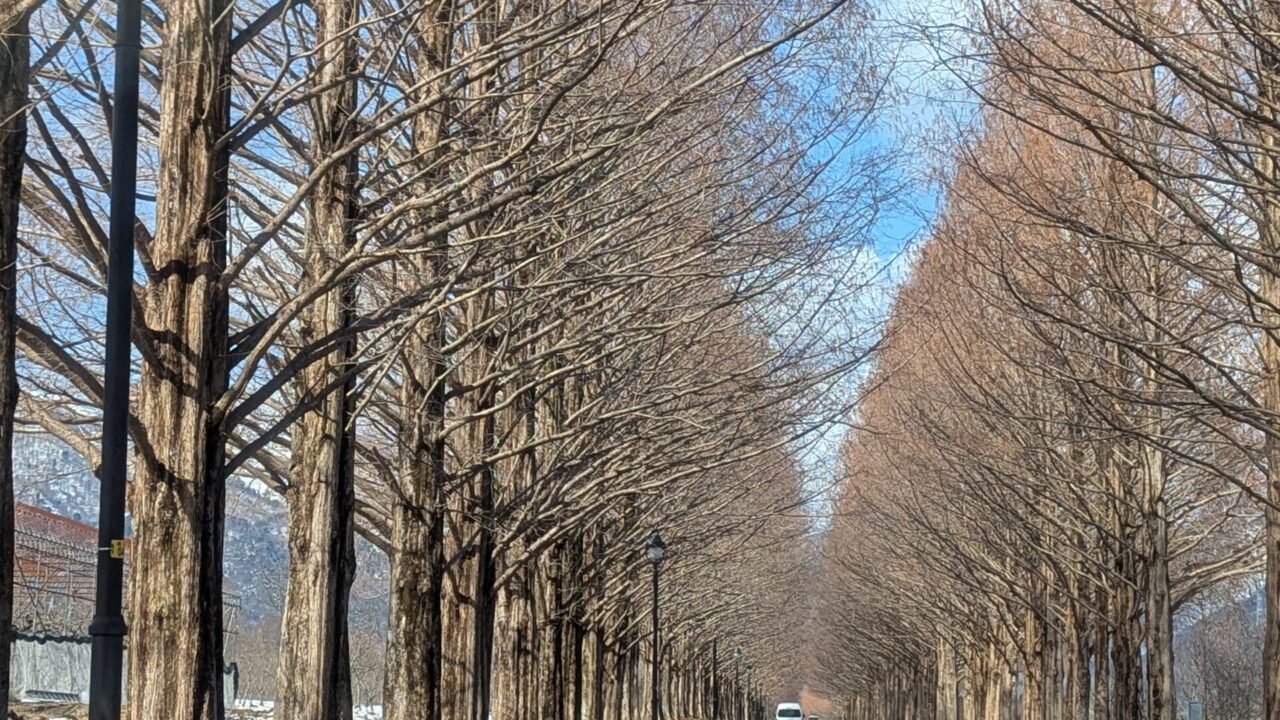 並木の中に入ると、メタセコイアは枯れて、冬バージョンです。これはこれでキレイです。