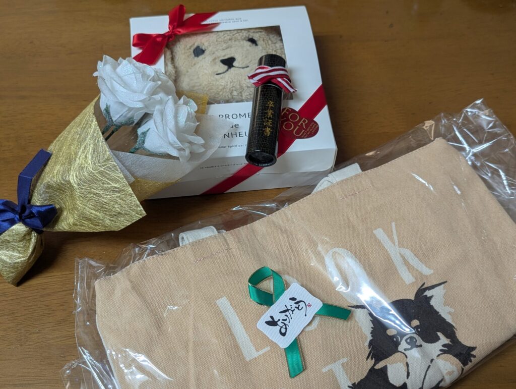 チワワがプリントされたトートバッグや、手作りのお花。卒業証書。お菓子。ワンちゃんの形のポーチ。