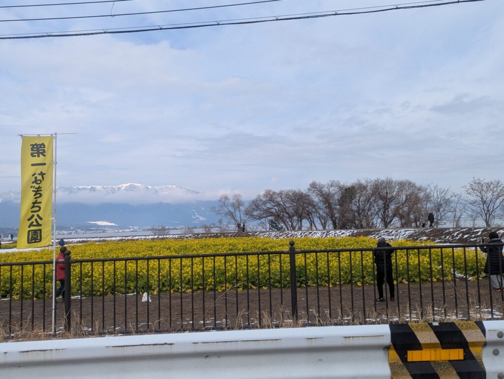 お天気の良い日なら、青空と雪と琵琶湖と菜の花の四重奏で、とても素敵なんですよー