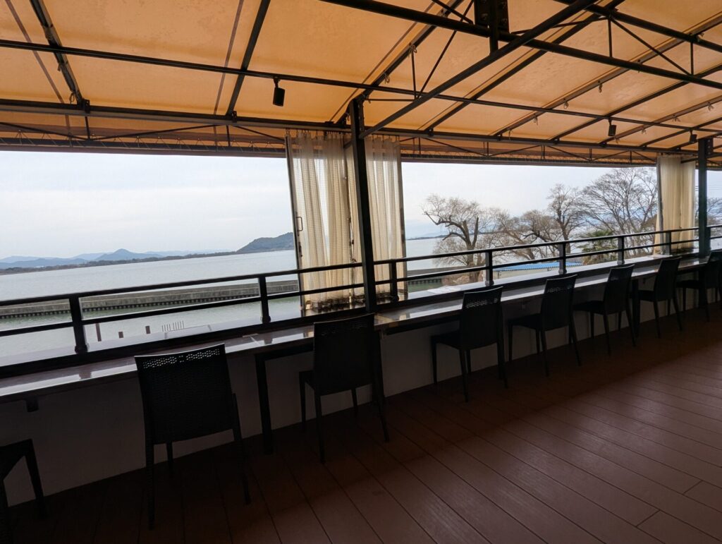 テラス席は琵琶湖に向かっているので、暖かい天気の良い日は、ここでボーッとしたいものです。