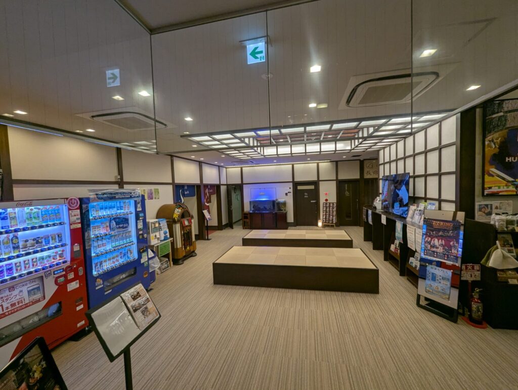 下の写真はフロント横で、お風呂は左奥にありますよ。
