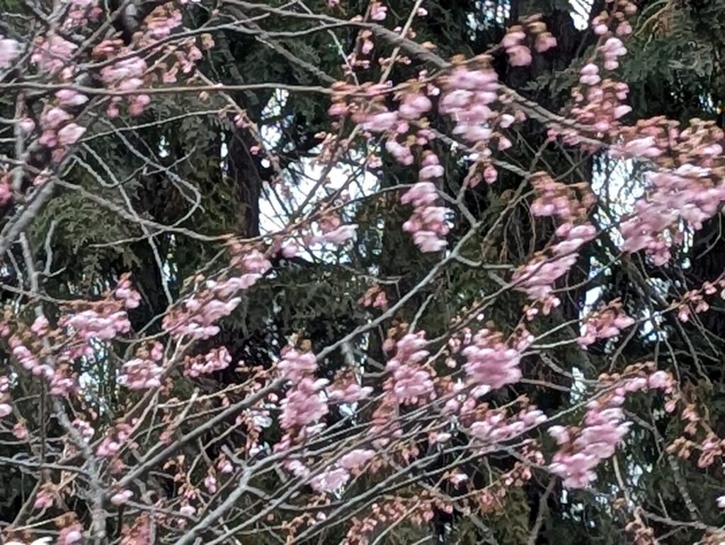 下の写真は、帰り道に車から慌てて撮った早咲きの桜です。
