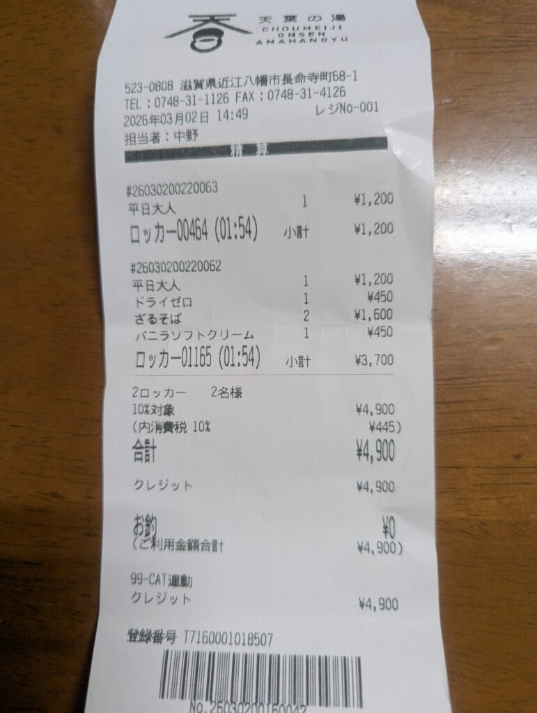 天羽の湯で使ったのは、お風呂代、2人分の昼食代、飲み物含めて4900円でした。