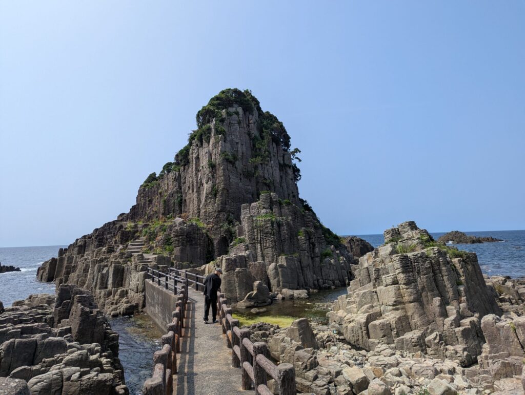 東尋坊と同じ柱状節理(ちょうじょうせつり)という地形で、海に突き出るようにそそり立ち、岩が鉾を立てたように見えることから、この名前がついたそうです。
