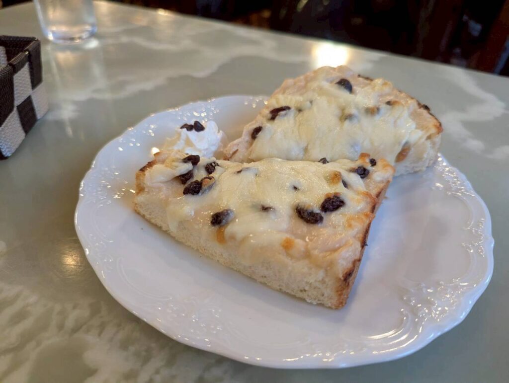 パンに酒粕を塗り、チーズとレーズンを乗せたトーストです。