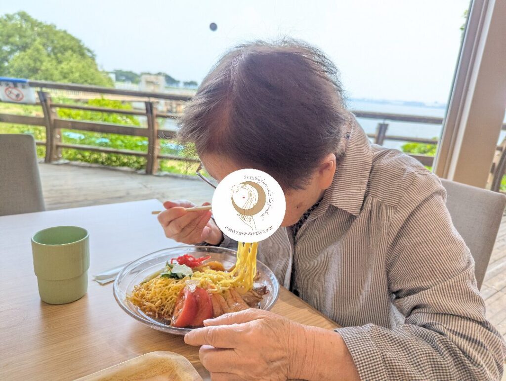 私と義母が先に食べ、夫が食べに行っている間車内で私と義母といろはが残ります。