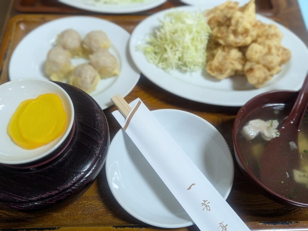 どの定食を頼んでも、シュウマイはついてきます。私たちは「えび天定食」にしました。