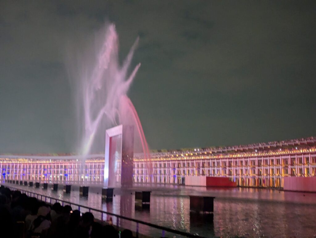 コンクリートのベンチなので、お尻痛くなると思います。噴水ショーは15分間くらいに感じました。右はしから見る噴水ショーは、見応えは少し残念でした。
